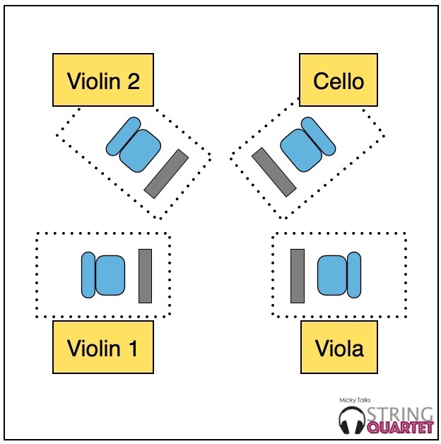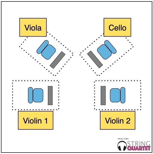 由左至右分別為「第一小提琴-第二小提琴-中提琴-大提琴」,這是目前最常被演出的坐法,聲音的分佈由左到右,從高到低排列整齊,井然有序,而且內聲部(第二小提琴及中提琴)被包覆於內,聽起來均衡而統一,每個樂器的聲音很好被分辨,一提二提相鄰而坐,在很多和弦上產生的共鳴上可以有很一致性的氛圍。