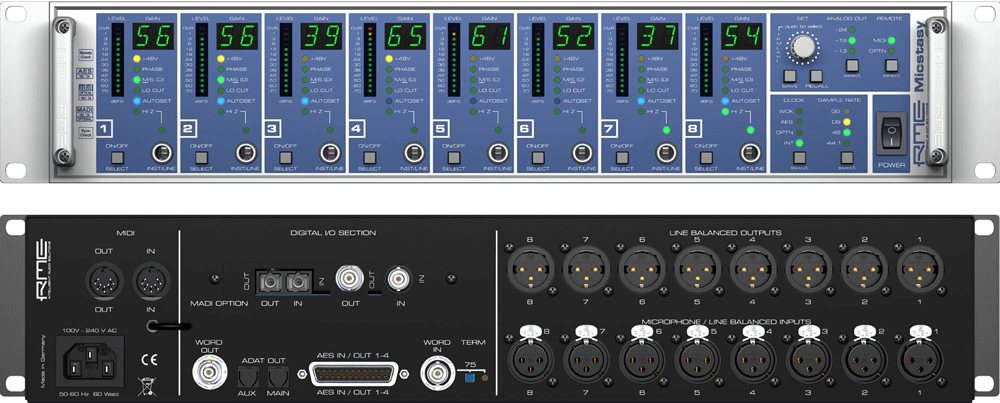 德國RME出品,內含A/D,RME在14年前Fireface大賣之後,緊接著推出低階的Octamic,不過,又賣太好,慢慢他們把目標鎖定在高階市場,推出這台Micstasy,除了支援你知道的所有接口外,並且把當時剛要開始萌芽的Madi介面以子卡的方式加入,果然在市場上獲得極大的成功。