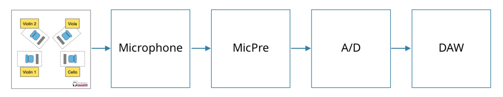弦樂錄音的訊號鏈相當單純,Source撞到麥克風,使用自己喜歡的MicPre,然後一台好A/D,就進去DAW了,不需要花俏的串接一堆東西,因為Acoustic類型的樂器,保持原貌錄進來是很重要,也是一個挑戰。