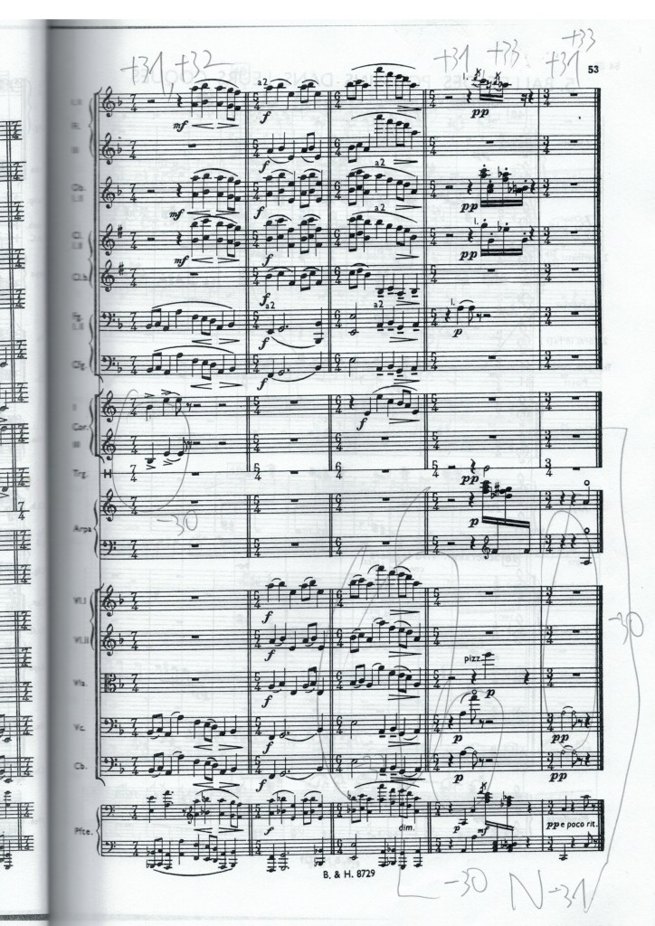 先來看看譜的那一張照片,在第一小節法國號那邊我畫了1個圈圈,上面寫著-30,然後在譜的最上端,我寫著+31,+32,這個的意思就是在這裡,第30 take法國號鳥掉,但在第31, 32 take不錯,結尾時31 take有雜音(N)要注意,33 take整個來說都不錯。