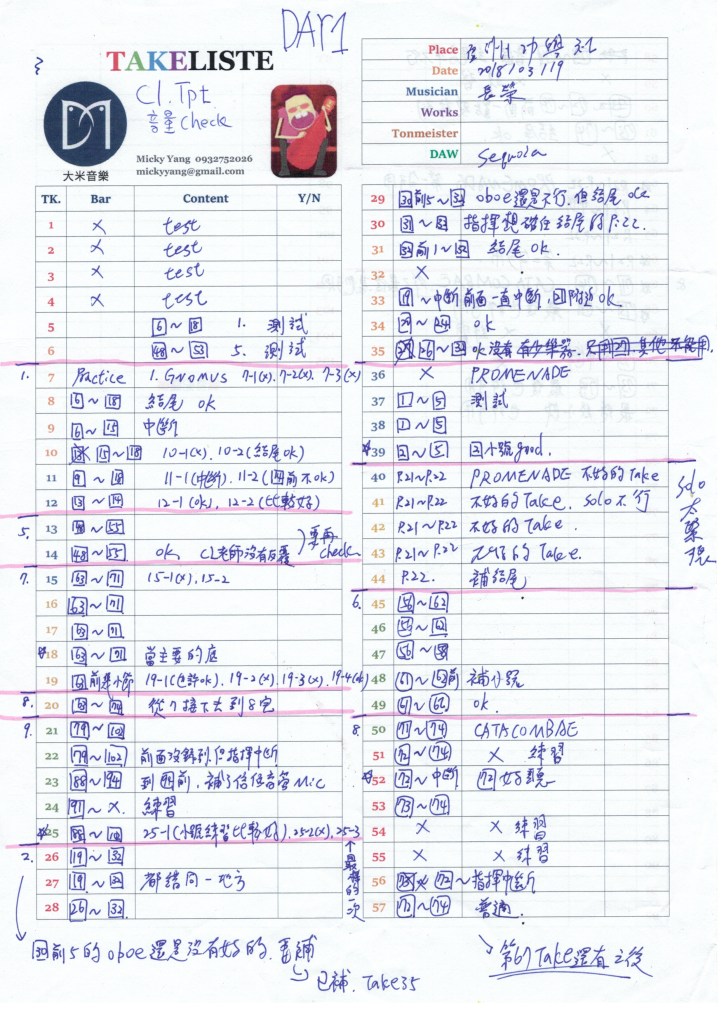 這是TAKE LIST,什麼叫做take呢,就是按下錄音鍵,然後按停止,中間錄下來的東西,就叫做take,古典樂種和其餘的樂種一樣,同一個地方都會演奏並錄製多次,就會產生很多take,有這個takelist就可以很方便的把你自己想紀錄上去的標記好,最後再和譜一起配合著剪接。