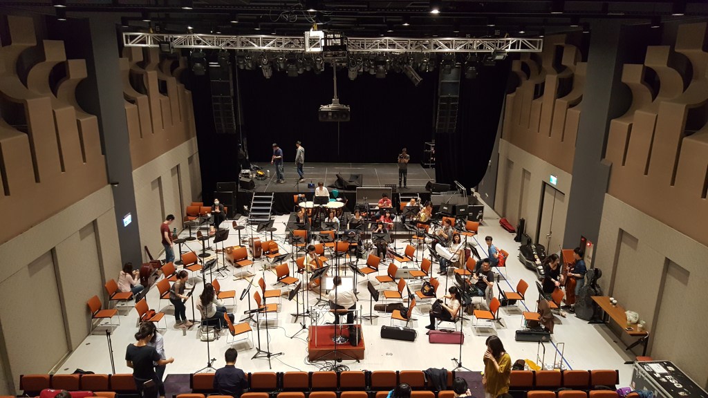 缺:空調噪音驚人,牆面反射快,雖然可以容納70人,但相對天花板不高,打擊以及銅管的音壓整個排練室吃不下來,再加上耳機工作,所以在判斷上很不容易成功。