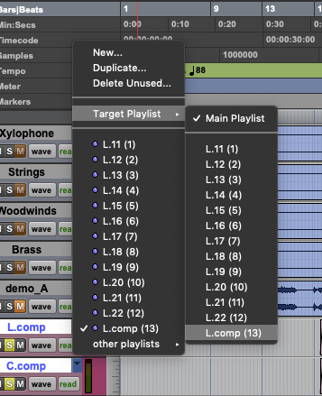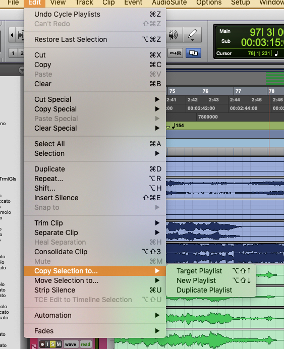 一種是跟以往很像,但不用進入Playlist View,而是在跳好某個Playlist上的Take區塊後,選擇Edit–Copy Selection to…..,也可以用Shift+option+上箭頭直接熱鍵解決
