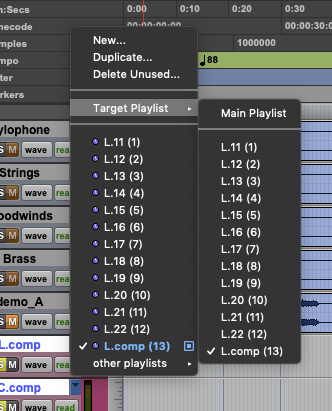 首先,先Duplicate一個新的Playlist,並且命名為你比較清楚的編輯名稱(例如XXXX.comp),然後在Playlist的小三角形,把滑鼠滑到Target Playlist的地方,你會看到你所有的Playlist,這時你可以選擇你的Target Playlist