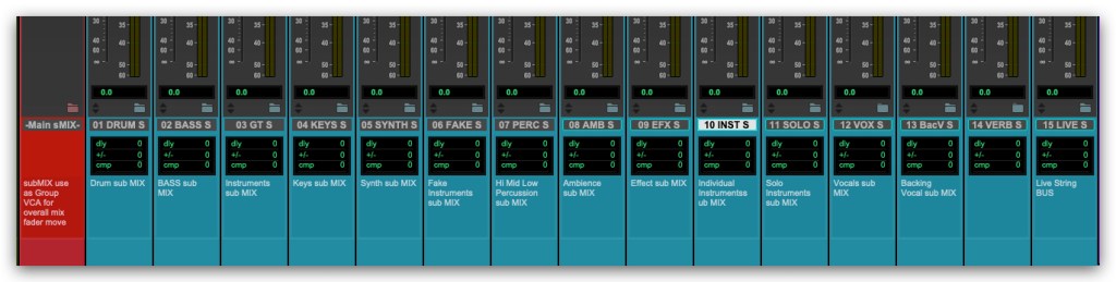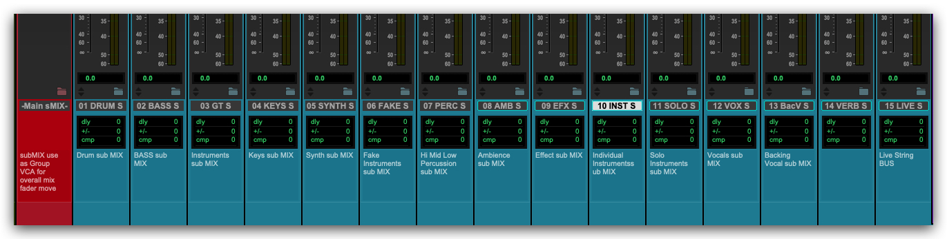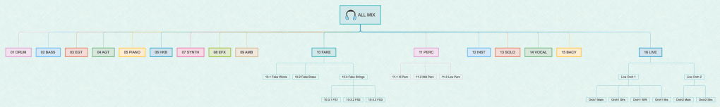 首先,你先以自己做過的案子來想,大概都會分為哪些Stem,我自己的話,因為比較常接觸的還是配樂以及演唱會前製錄音居多,所以我大概分了16個Stem