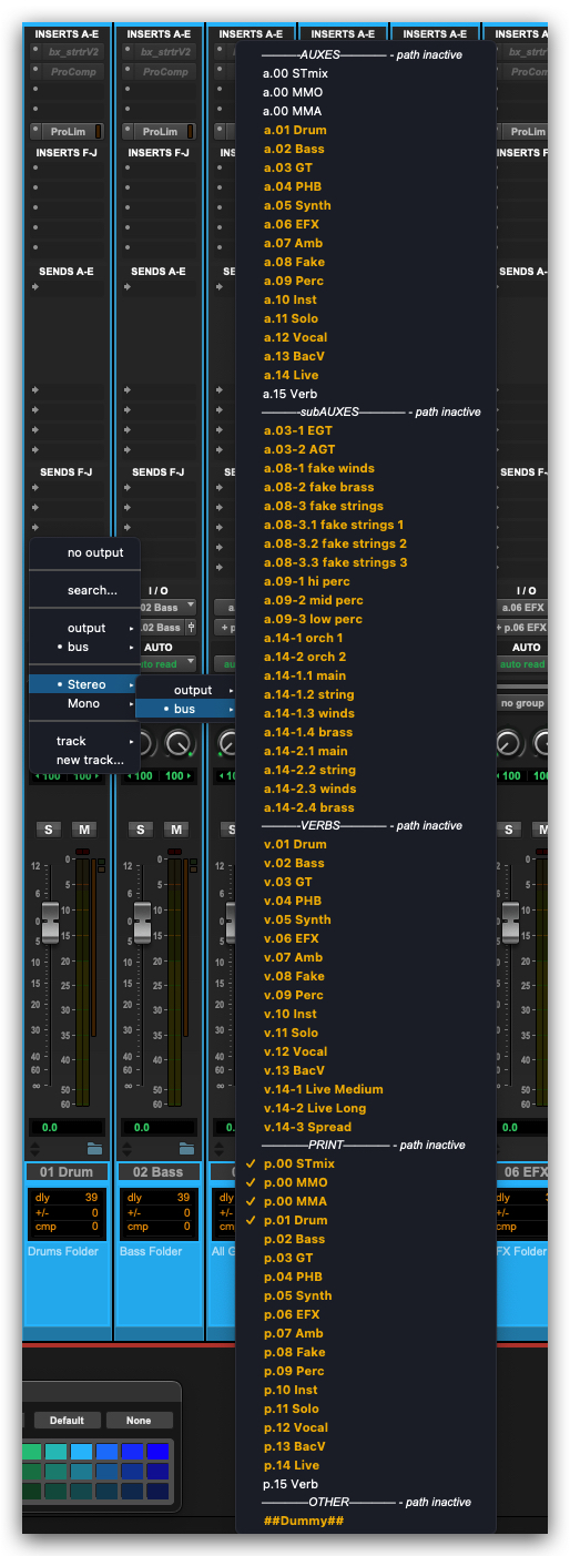 第一就是先設定Aux Bus還有sub-Aux Bus,我依據我的圖,先設了16個依據Stem名稱的Aux,前面我會加個小a.還有編號,號碼的好處就是縮小時,很多字會被吃掉,但號碼一定在,二前面的小a是讓我在選擇時,知道這是Aux。